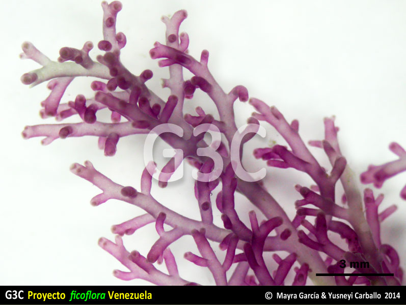 Gómez, S., 1998Rhodophyta (Algas marinas rojas) del Parque Nacional Archipiélago Los Roques. Tesis de Doctorado. Tesis (Doctorado). Facultad de Ciencias, Universidad Central de Venezuela. Caracas, Venezuela, 299 pp. |