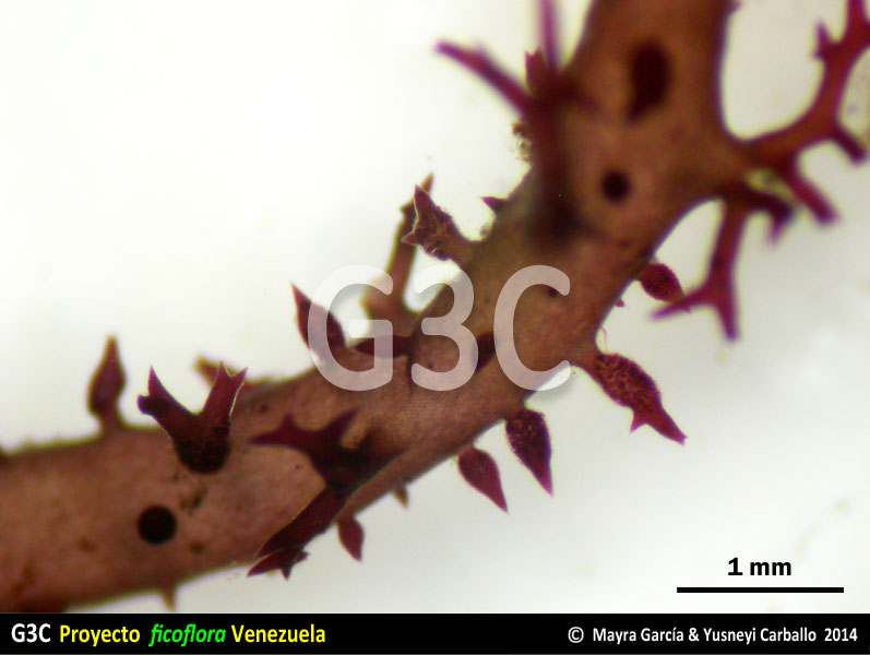 Gómez, S., 1998Rhodophyta (Algas marinas rojas) del Parque Nacional Archipiélago Los Roques. Tesis de Doctorado. Tesis (Doctorado). Facultad de Ciencias, Universidad Central de Venezuela. Caracas, Venezuela, 299 pp. |